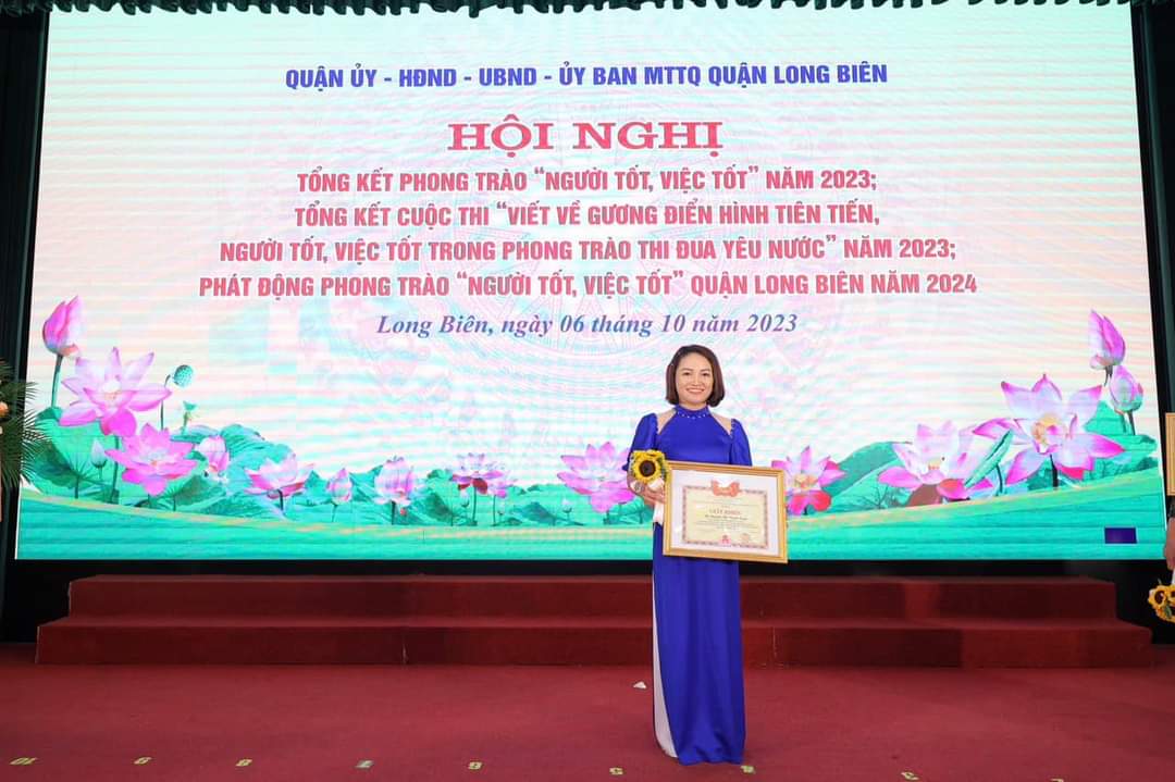 “ Mỗi người tốt, mỗi việc tốt là một bông hoa đẹp, cả dân tộc ta là một rừng hoa đẹp”. Thấm nhuần lời dạy của Bác, tập thể CBGVNV trường Mầm non Gia Thụy luôn ra sức thi đua, rèn luyện phấn đấu làm tốt công tác chăm sóc nuôi dưỡng giáo dục các con học sinh thân thân yêu, tham gia tích cực mọi phong trào hoạt động và công tác từ thiện nhân đạo…....Một trong những điển hình “ Người tốt, việc tốt” trong nhà trường là cô giáo Nguyễn Thị Thanh Xuân - Bí thư Chi bộ, Hiệu trưởng nhà trường. Và thật vinh dự tự hào, sáng ngày 06/10/2023 đồng chí Xuân đã được khen thưởng trong Hội nghị: Tổng kết phong trào "Người tốt, việc tốt” năm 2023. Tổng kết cuộc thi “ Viết về gương điển hình tiên tiến, người tốt việc tốt trong phong trào thi đua yêu nước" năm 2023. Phát động phong trào “ Người tốt, việc tốt” quận Long Biên năm 2024. Xin chúc mừng và biểu dương đồng chí Nguyễn Thị Thanh Xuân người Thủ trưởng đầu tầu gương mẫu luôn là tấm gương sáng cho CBGVNV noi theo.