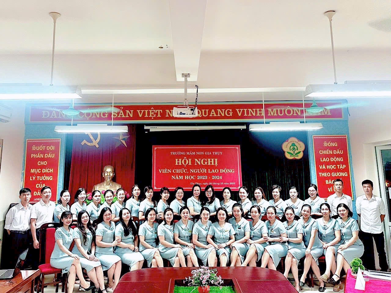 Thực hiện công văn số 05 /HD -LĐLĐ ngày 07/8/2023 của Liên đoàn lao động Quận Long biên về quy trình tổ chức Hội nghị CBCCVC khối trường học năm học 2023-2024. Ngày 04/10/2023 Trường Mầm non Gia Thụy phối hợp với Công đoàn trường long trọng tổ chức Hội nghị CBCC,VC năm 2023-2024.