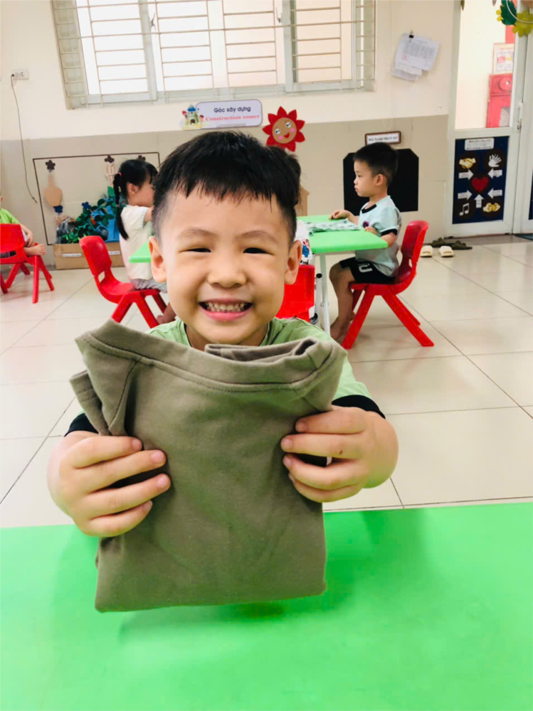 Lúc đầu, nhiều bé còn lúng túng, vụng về. Nhưng chỉ sau một thời gian quan sát và thực hành, các con đã biết cách trải quần áo ra thẳng phẳng, gập hai bên tay áo vào trong, gập theo đường nếp gấp có sẵn – đôi bàn tay bé xíu nhưng rất chăm chú và cố gắng.