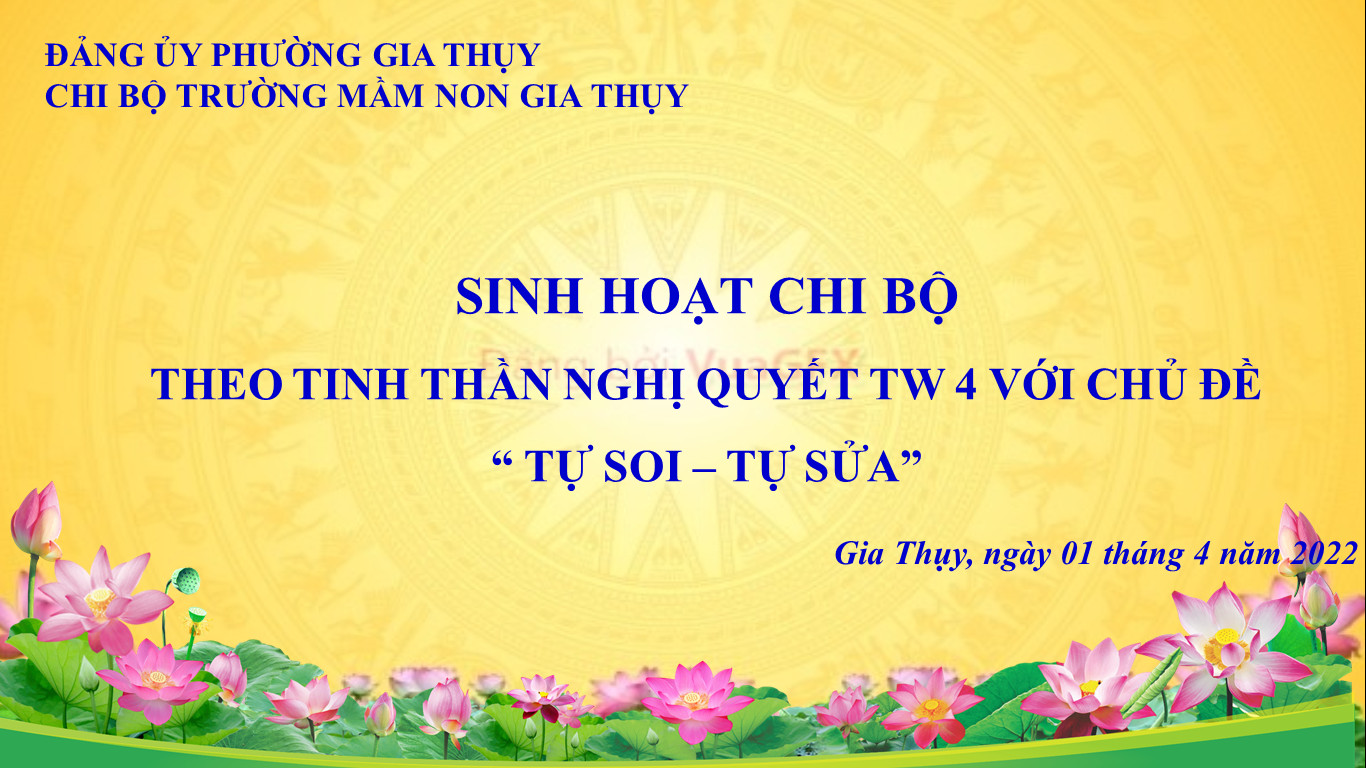 Vào hồi 8 giờ 30 sáng ngày 1/4/2022, tại phòng zoom, chi bộ trường MN Gia Thụy đã tổ chức Hội nghị sinh hoạt chính trị trong Đảng theo tinh thần Nghị quyết Trung ương 4 (khóa XIII) với chủ đề "Tự soi, tự sửa". Hội nghị sinh hoạt được diễn ra nghiêm túc dưới sự chủ trì của đồng chí Nguyễn Thị Thanh Xuân-Bí thư chi bộ- Hiệu trưởng nhà trường và 100% các đ/c đảng viên tham dự.