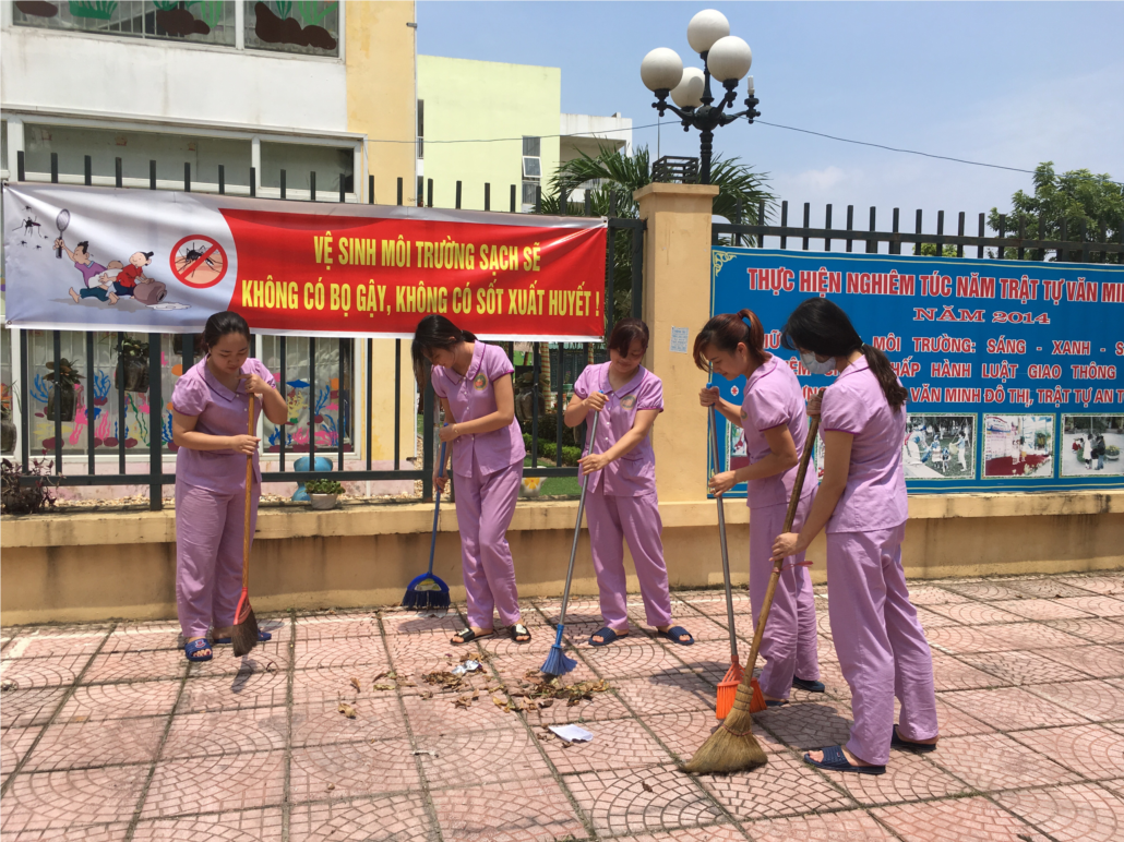 Trên cơ sở đó, tất cả các phòng học, phòng làm việc và khuôn viên của nhà trường đã tổ được chức vệ sinh phòng học, đồ dùng, đồ chơi thu gom, vận chuyển rác tới các thùng rác đặt đúng nơi quy định. Tiếp đó, các cán bộ, giáo viên, nhân viên nhà trường và các hộ dân sống xung quanh trường tiến hành vệ sinh môi trường khơi thông cống rãnh, phát quang bờ bụi rậm, làm sạch nhà vệ sinh...