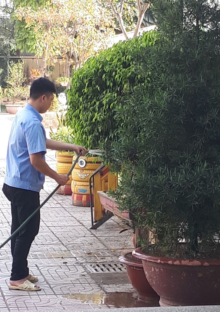 Ngoài nhiệm vụ trực đóng mở cửa, trông xe, bảo quản các tài sản của nhà trường anh còn giúp đỡ mọi người như: Khi ở bếp các chị dọn rửa bát cho các con thì anh cũng vào hỗ trợ các chị úp cất dọn đồ đạc. Khi các cô nhờ đóng đinh hay bê vác nặng anh không hề nề hà. Những lúc rảnh rỗi anh tưới và chăm sóc cây trong vườn trường để sân vườn luôn sạch đẹp và nở hoa tươi tốt. Không chỉ vậy có lần tôi còn thấy anh tỉ mẩn nhổ từng cái đinh trên khu vực sân khấu để các con đi không bị vấp ngã đảm bảo an toàn cho trẻ. Vì trẻ con luôn hiếu động, vội vàng, hấp tấp. Sự phấn đấu và cố gắng trong công việc đã giúp anh giành được rất nhiều sự tin yêu quý mến của các bậc phụ huynh, các đồng nghiệp trong nhà trường và các con.