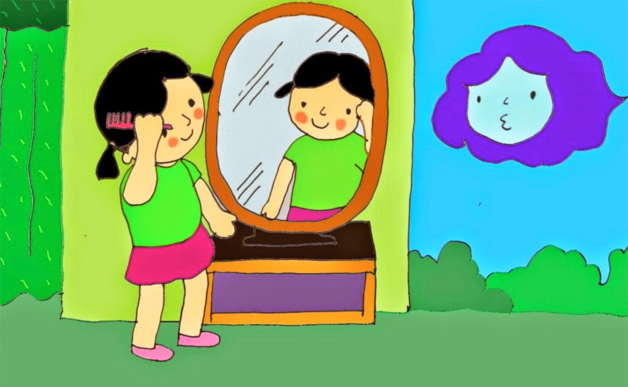 Một buổi sáng, bé Na thức dậy, soi vào chiếc gương nhỏ trên bàn. Gương cười nói:
