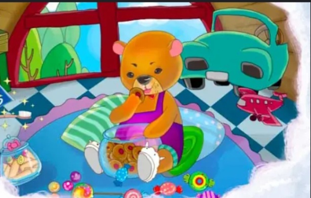 - Này Gấu Con, răng cháu sâu nhiều quá, phải chữa ngay thôi. Nếu để lâu sẽ bị sún hết đấy. Cháu nhớ là không nên ăn nhiều bánh kẹo, nhất là vào buổi tối. Hằng ngày, cháu phải đánh răng trước khi đi ngủ và sau khi ngủ dậy !