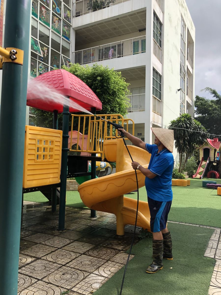 ✅ Khi các trẻ đến trường sẽ được kiểm tra thân nhiệt, xịt dung dịch sát khuẩn tại cổng trước khi vào trường.