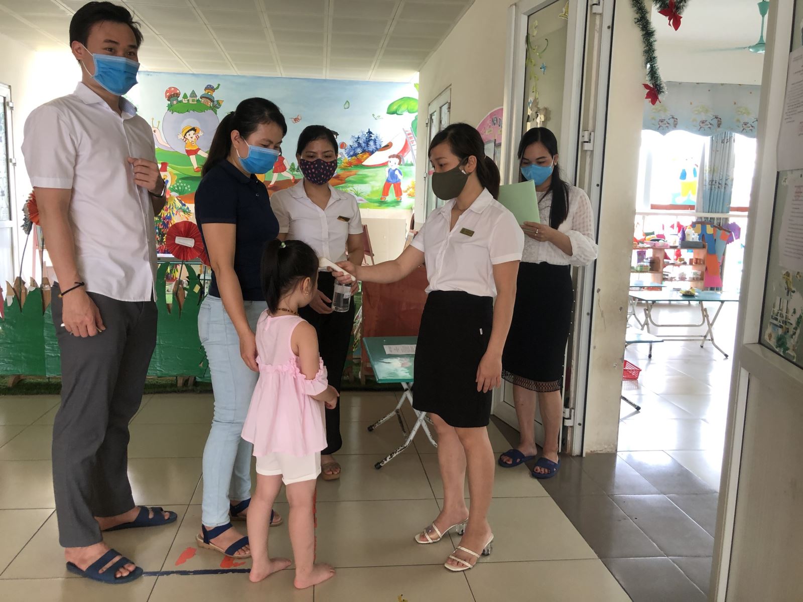 Trước khi vào lớp học sinh được các cô kiểm tra thân nhiệt, xịt dung dịch rửa tay trước khi vào lớp.