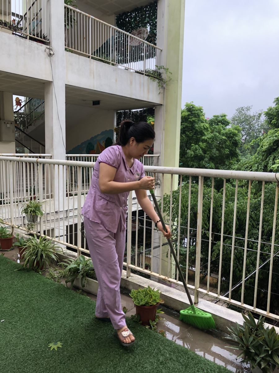 CBGVNV cùng quét dọn sạch sẽ khu vui chơi của trẻ, kiểm tra và dọn sạch các khu vực đọng nước để phòng tránh muỗi, côn trùng . Ở mỗi lớp học, các cô vệ sinh đồ dùng, đồ chơi, lau lá cây, tủ đồ dùng của trẻ, vệ sinh lớp học, lau nền nhà bằng dung dịch. Bên cạnh đó, nhà trường cũng luôn chú trọng công tác tuyên truyền phổ biến đến các phụ huynh các biện pháp phòng bệnh trên loa phát thanh của nhà trường vào mỗi giờ đưa đón trẻ trong ngày.