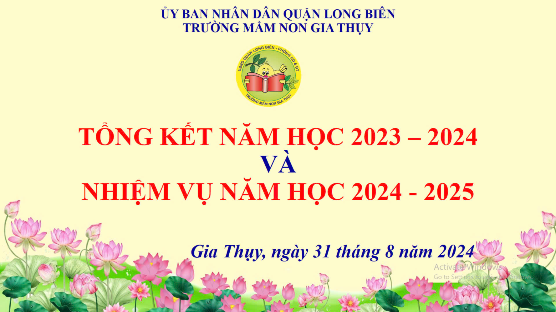 Kết thúc Hội nghị, đồng chí Hiệu trưởng Nguyễn Thị Thanh Xuân thay mặt Ban giám hiệu nhà trường chúc các đồng chí CBGVNV trong trường luôn mạnh khỏe hạnh phúc, chúc cho trường Mầm non Gia Thuỵ một năm học mới gặt hái được nhiều thành công, tập thể nhà trường vững mạnh, đoàn kết và ngày càng phát triển.